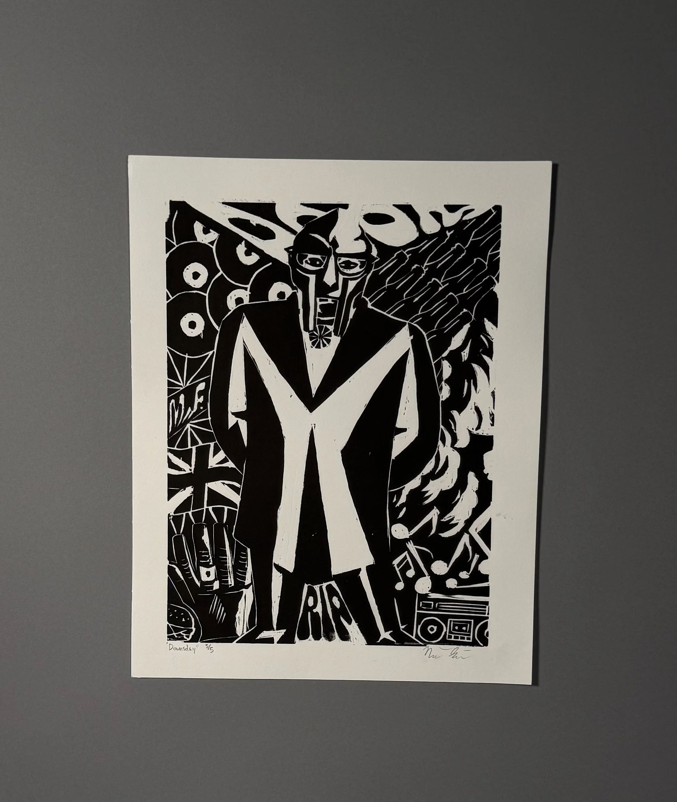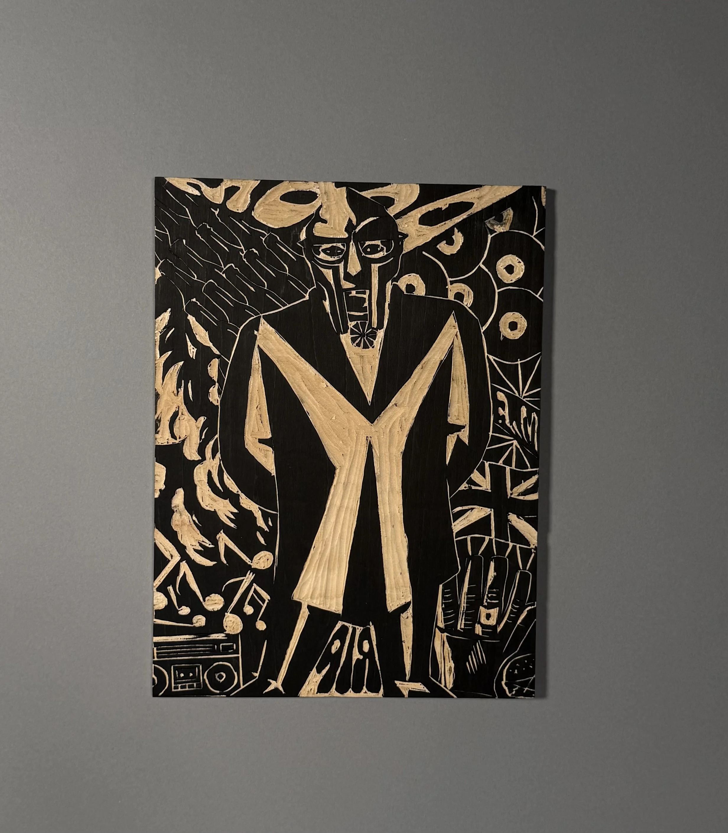 Throughout this project, I attempted to capture the persona of MF DOOM through a medium completely new to me. Throughout this process, I aimed to blend bold pop cultural elements with traditional printmaking techniques. My final piece is a modernized version of a piece by Frans Masereel called “The Geschaftsmann”.